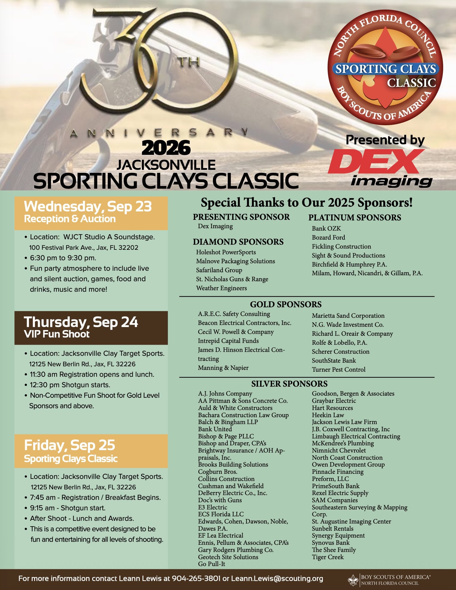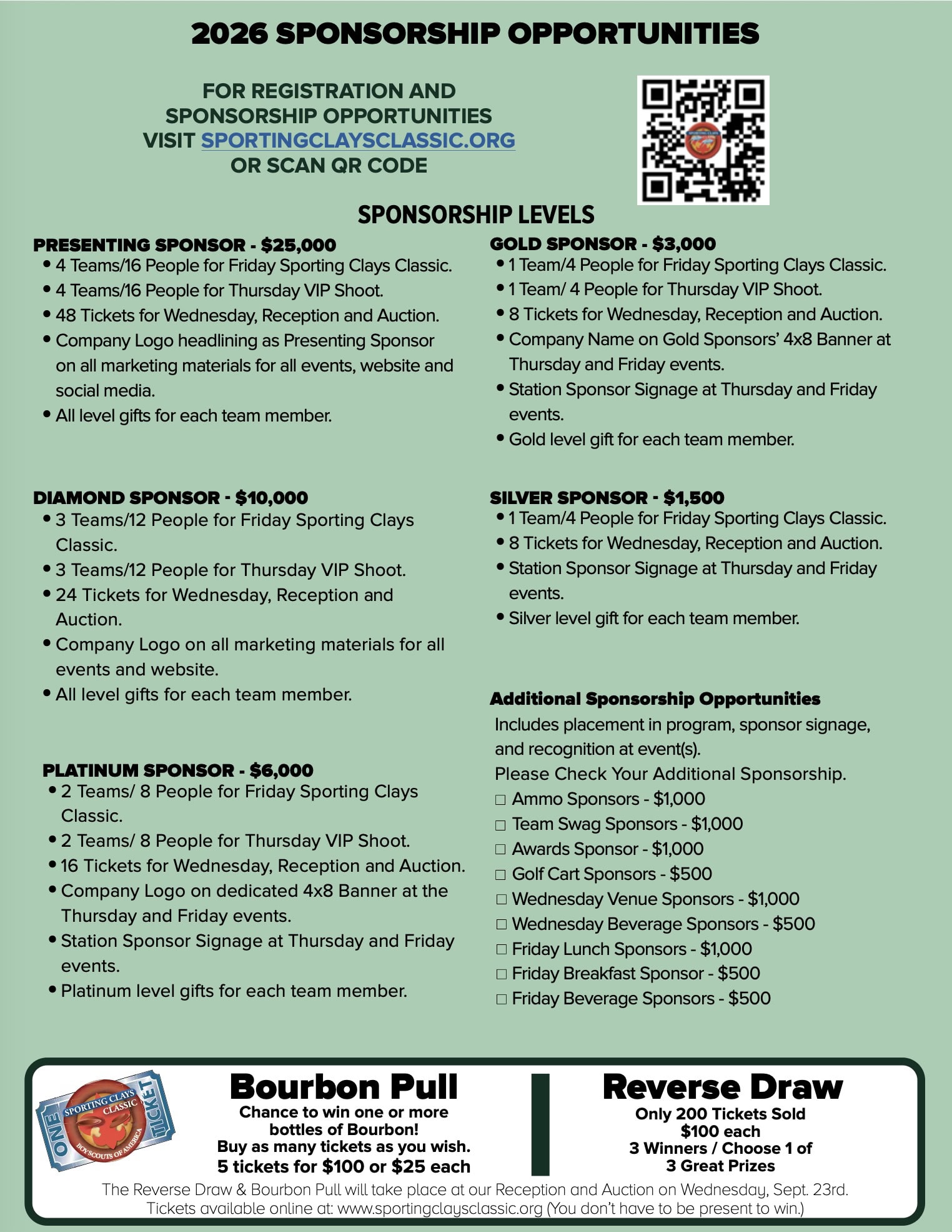Celebrating our 30th JacksonvilleSporting Clays Classic September 23-24-25, 2026 Event INFOMENUJacksonville EventSponsorshipsReception/AuctionScheduleReverse DrawBourbon PullCommittee MembersBrochure Brochure Download Flyer